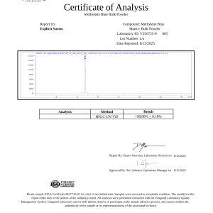 Methylene Blue is a synthetic compound with a long history of use in scientific research. As a redox-active molecule, it is widely studied for its potential effects on mitochondrial activity, cellular energy production, and oxidative stress. In drop form, this 1% solution (10mg/ml) allows for precise administration in laboratory settings.
